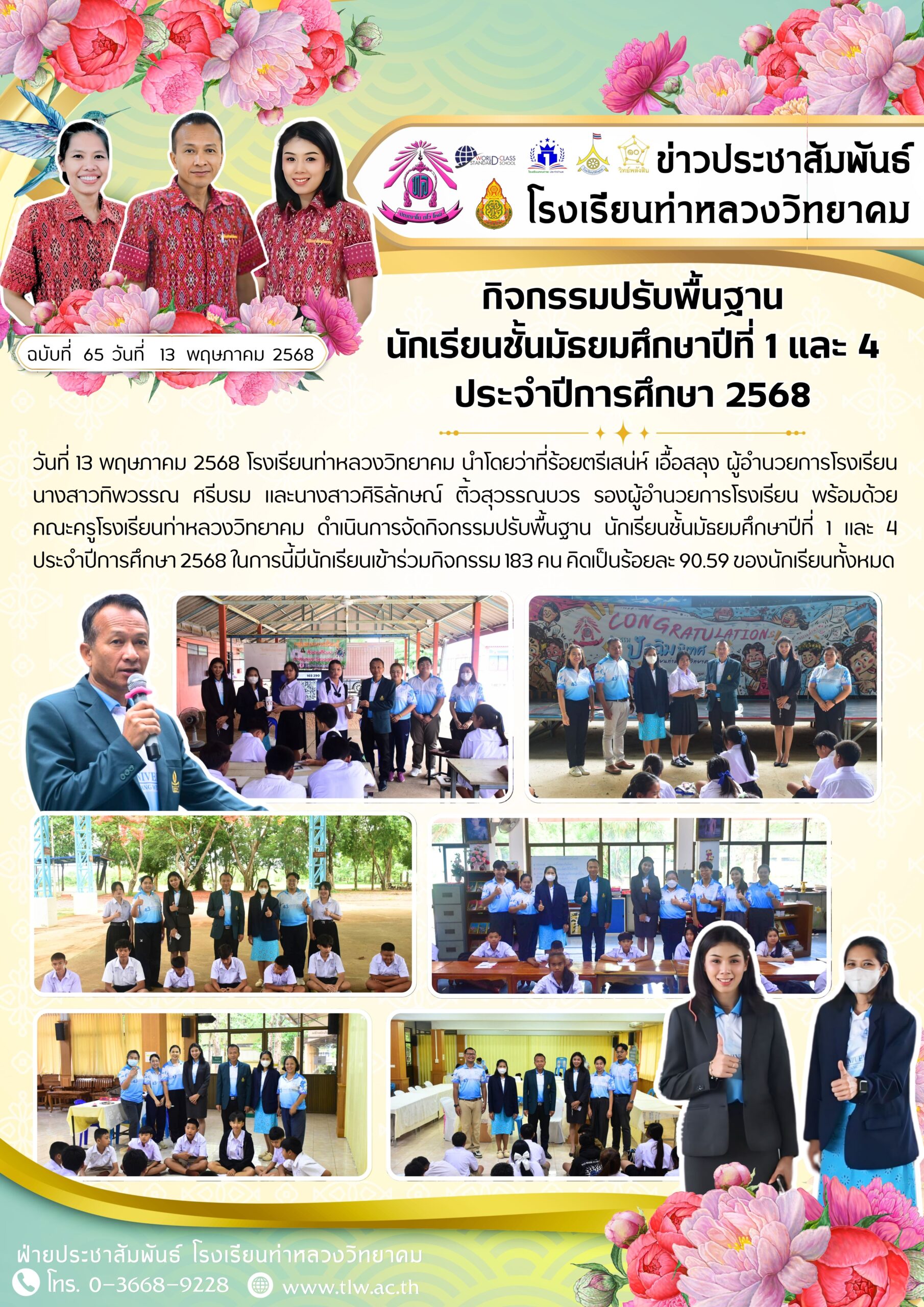 วันที่ 13 พฤษภาคม 2568 โรงเรียนท่าหลวงวิทยาคม นำโดยว่าที่ร้อยตรีเสน่ห์ เอื้อสลุง ผู้อำนวยการโรงเรียน นางสาวทิพวรรณ ศรีบรม และนางสาวศิริลักษณ์ ติ้วสุวรรณบวร รองผู้อำนวยการโรงเรียน พร้อมด้วย คณะครูโรงเรียนท่าหลวงวิทยาคม ดำเนินการจัดกิจกรรมปรับพื้นฐาน นักเรียนชั้นมัธยมศึกษาปีที่ 1 และ 4 ประจำปีการศึกษา 2568 ในการนี้มีนักเรียนเข้าร่วมกิจกรรม 183 คน คิดเป็นร้อยละ 90.59 ของนักเรียนทั้งหมด